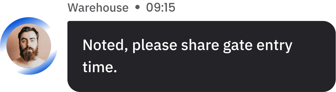 Shippers, carriers, consignees, everyone operates from a single shared screen. No scattered WhatsApp messages or missed updates.